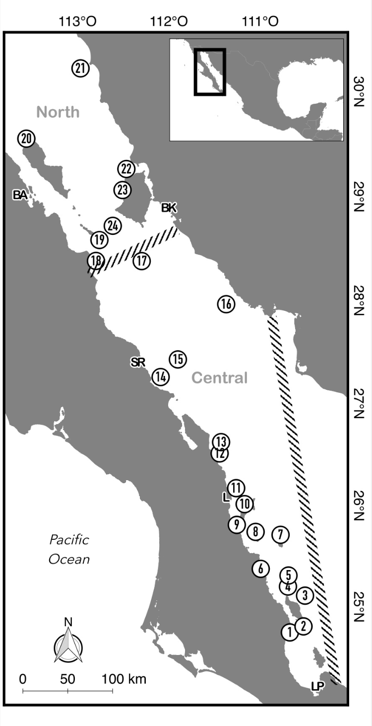 - Sitios de muestreo: 24 localidades distribuidas a lo largo del Golfo, cubriendo las regiones Norte, Central y Sur