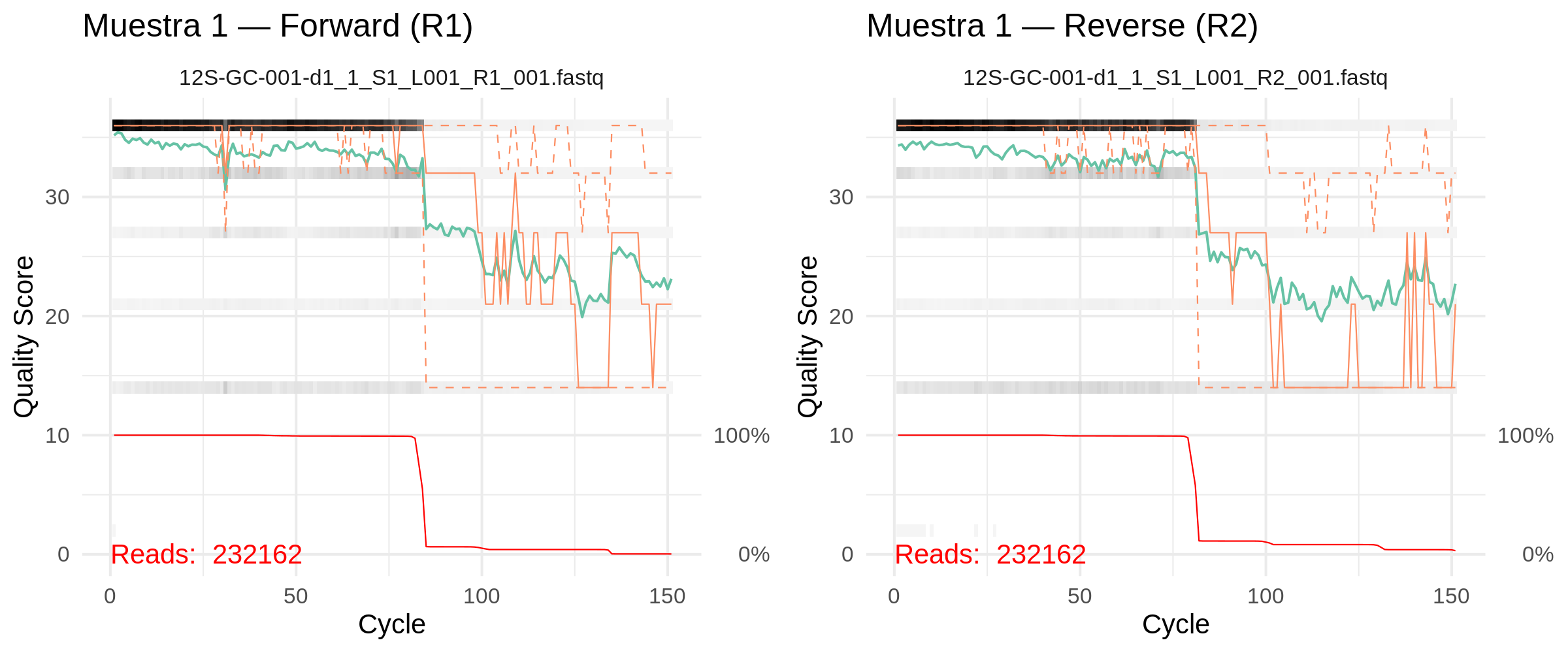 Qué hace: verifica que Cutadapt haya removido correctamente los primers. Si siguen presentes, DADA2 los interpretará como parte de la secuencia biológica y afectará el denoising.